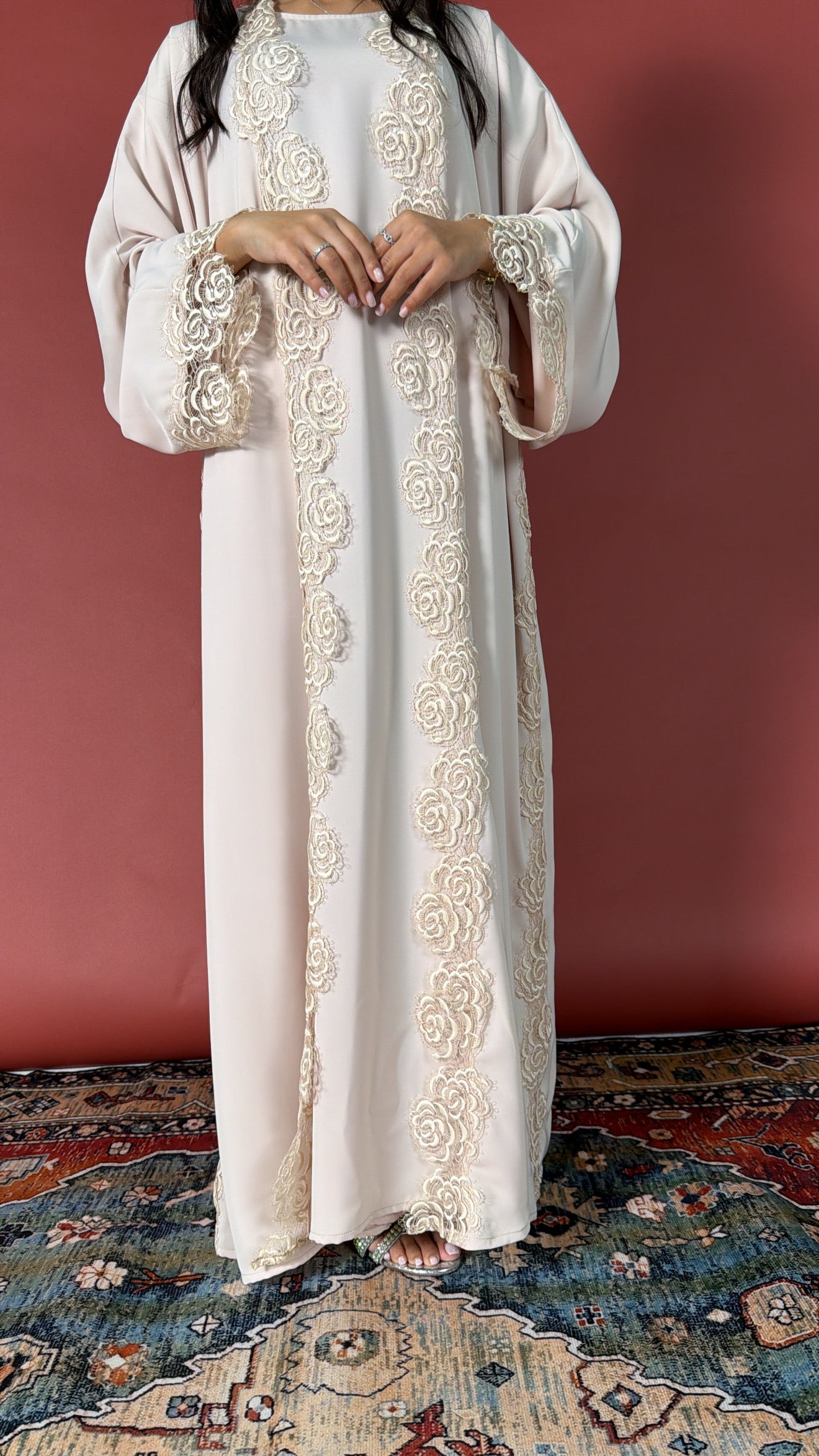 Kimono 3 pièces en soie de Corée – Beige & dentelle florale